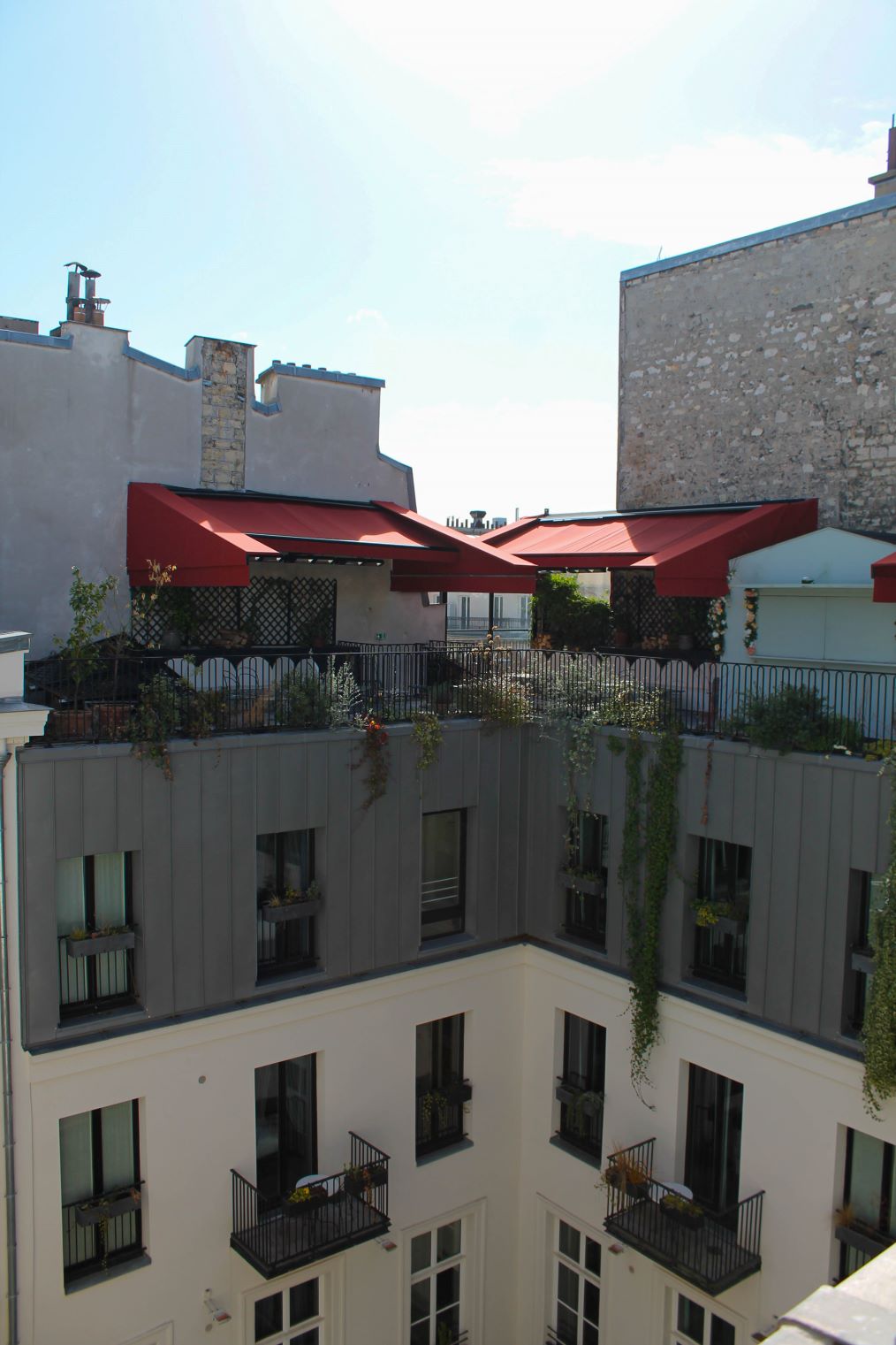 J’ai connu l’hôtel des Grands Boulevards grâce à sa terrasse, The Shed. C’est un rooftop à la décoration fleurie et une jolie vue sur les toits de Paris. J’y étais allée pour un afterwork entre copines. L’ambiance est décontractée et intimiste, et les cocktails excellents. De la terrasse, on voit aussi la verrière en dessous, et le joli restaurant, très prisé et recommandé. Pour info ; vous pouvez bruncher au restaurant de l’hôtel, le cadre est très agréable et la qualité des mets excellente.