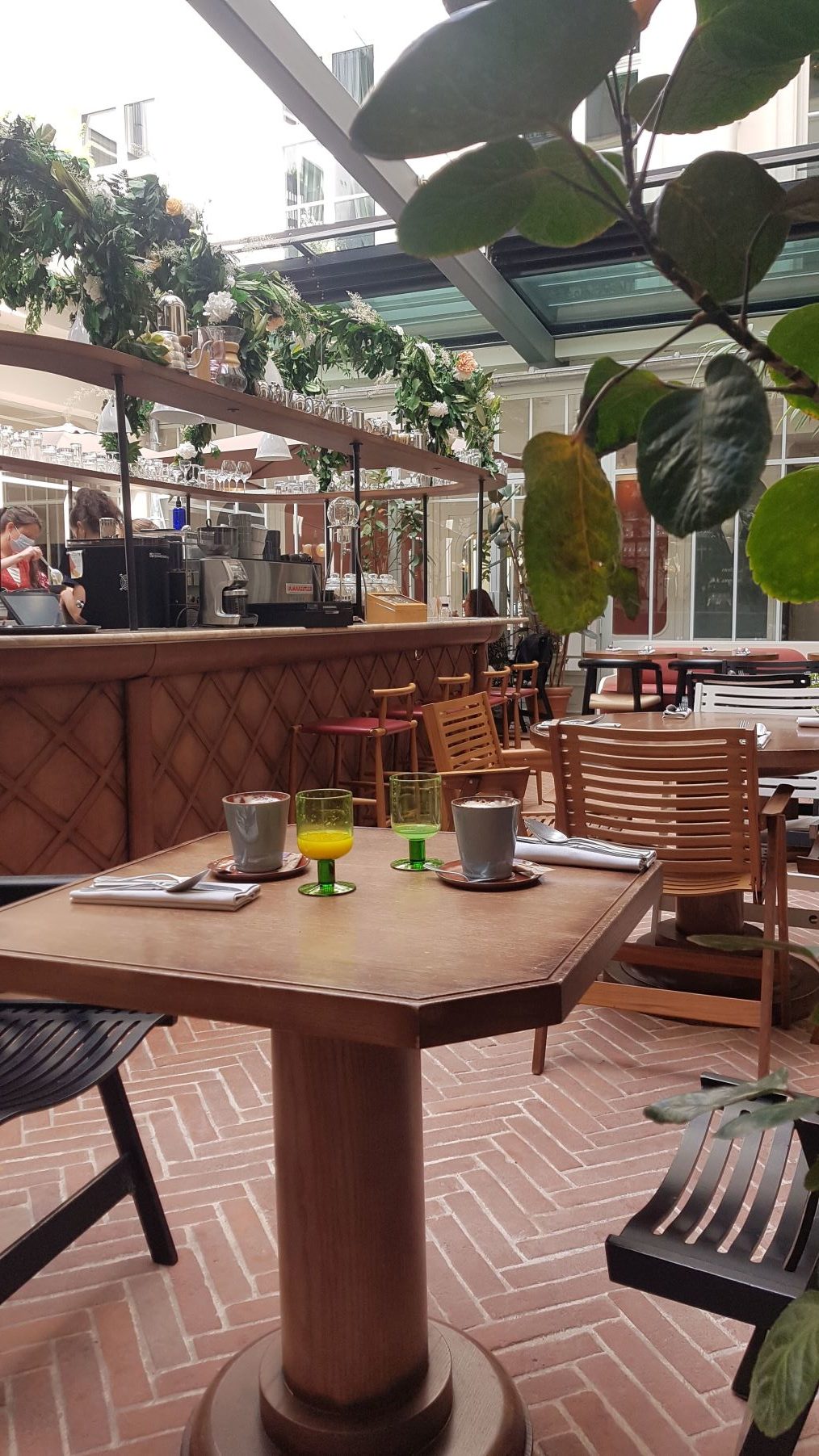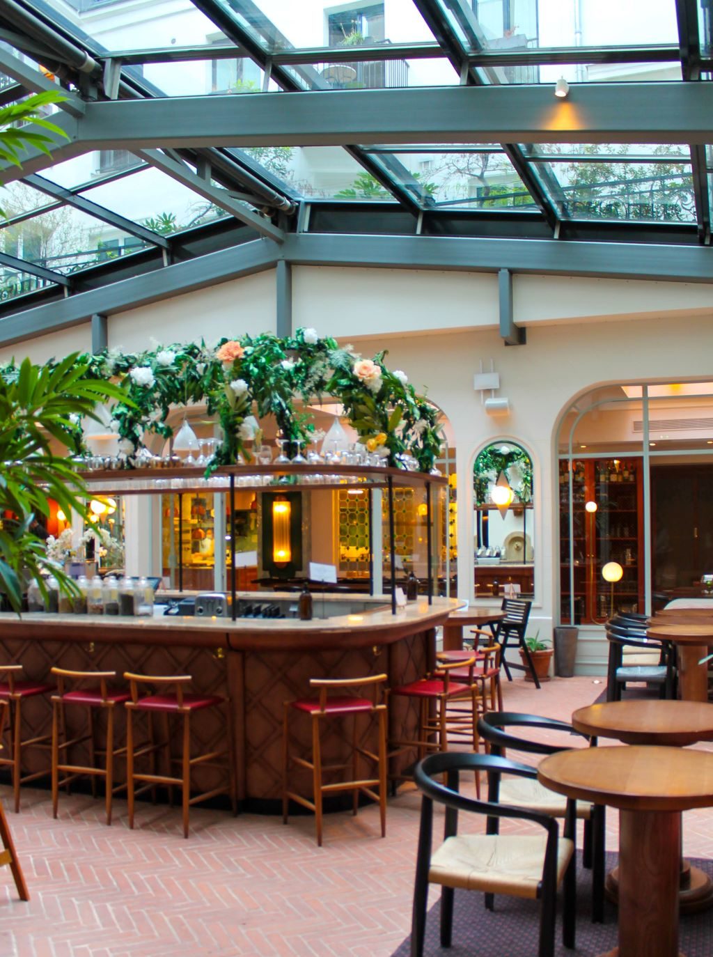 A l’hôtel des Grands Boulevards, le brunch comprend une boisson chaude, des boissons froides (même les pressées à froid, à volonté), 1 plat au choix (j’ai pris les œufs brouillés, avec des champignons et du fromage), une sélection de plats (saumon, hoummous, pouple etc.), des viennoiseries et des gâteaux. On y mange très très bien. Et quoi de mieux pour savourer son brunch que d’être sous la verrière de ce beau restaurant parisien.