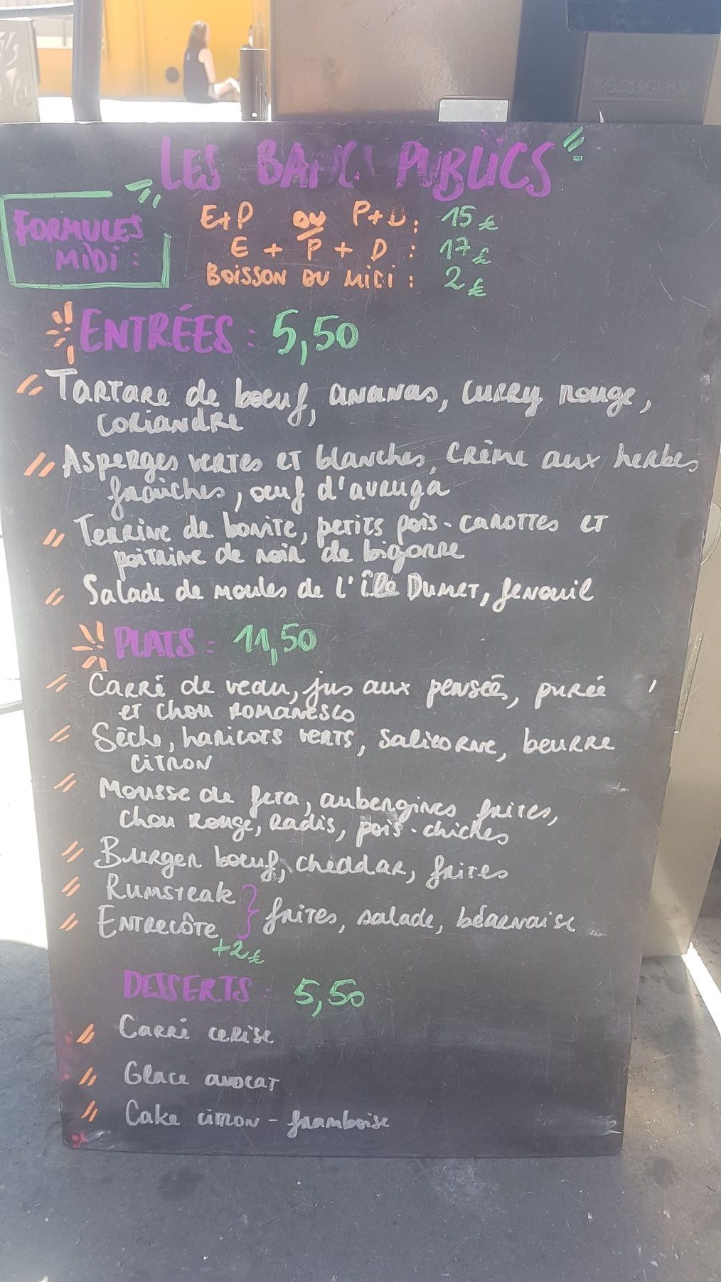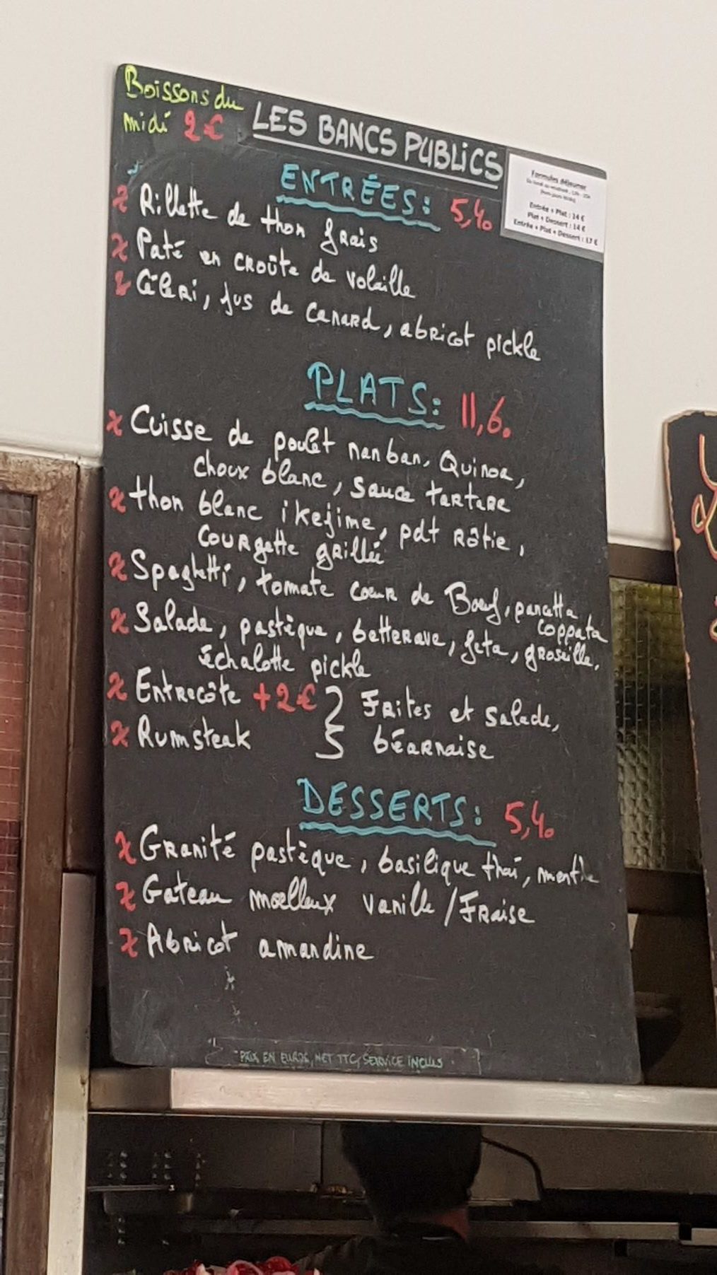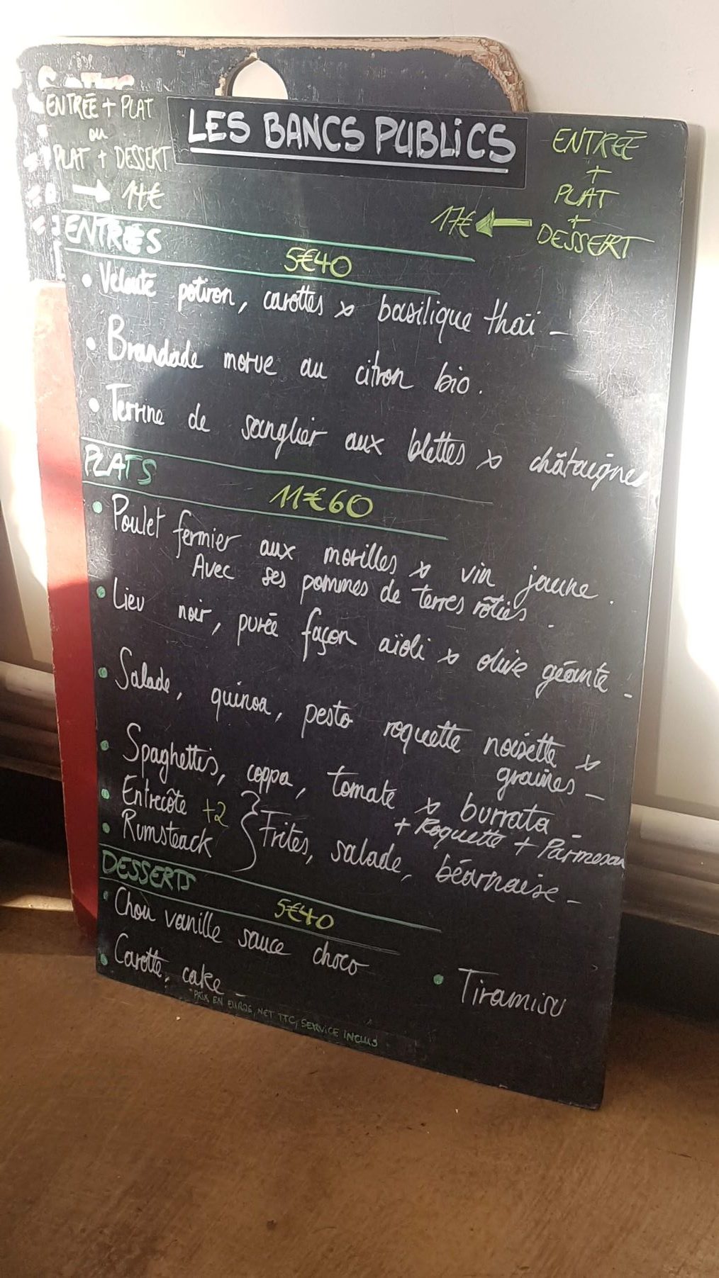 En plat principal, il y a toujours un plat poisson, un plat viande, un plat veggy, en plus du burger et du rumsteak qui pour ces 2 derniers, sont toujours à la carte. Que ce soit les plats ou les desserts, c’est super bons. Les quantités des plats peuvent être parfois petites, selon les jours. Pour ma part, je suis abonnée à la formule entrée + plat + dessert, qui coûte seulement 17€ le midi. Pour des plats de cette qualité, avec des mélanges souvent surprenants, et des produits de saison, c’est difficile de faire mieux !